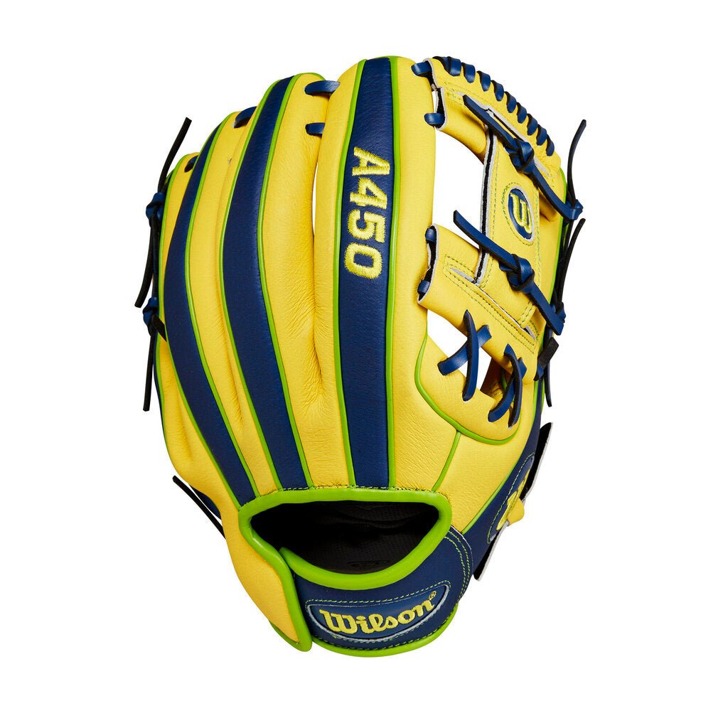 Bring the fun of Banana Ball to the baseball diamond with the 2026 Wilson A450 11-inch Savannah Bananas Youth Baseball Glove! This eye-catching glove is the perfect piece of youth performance gear for fans and players ready to learn the fundamentals with a fun, game-ready glove. Featuring the team's iconic Yellow, Navy, and Green colors and the official Savannah Bananas logo, this glove is designed for young infielders and utility players (ages 8-12) who want a soft feel and a secure fit.